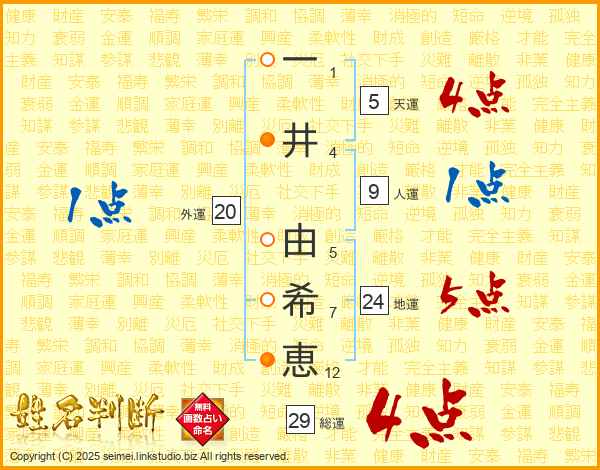 一(1画)井(4画) 由(5画)希(7画)恵(12画)