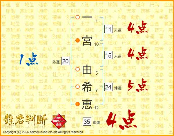 一(1画)宮(10画) 由(5画)希(7画)恵(12画)