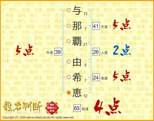 与(13画)那(7画)覇(21画) 由(5画)希(7画)恵(12画)