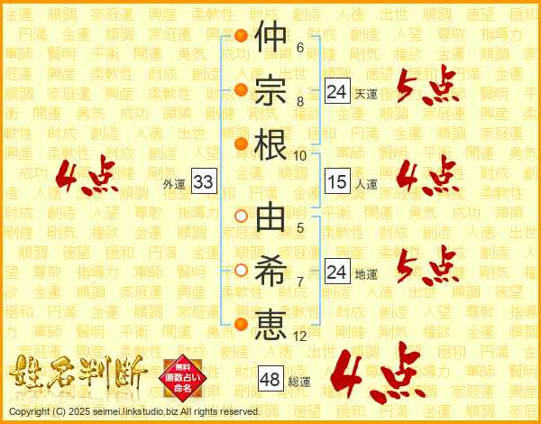 仲(6画)宗(8画)根(10画) 由(5画)希(7画)恵(12画)