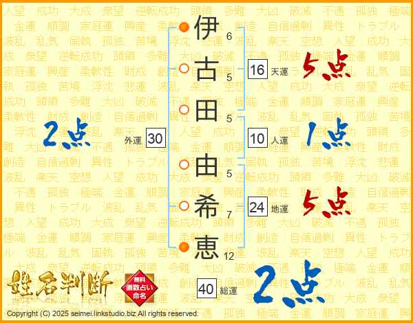 伊(6画)古(5画)田(5画) 由(5画)希(7画)恵(12画)