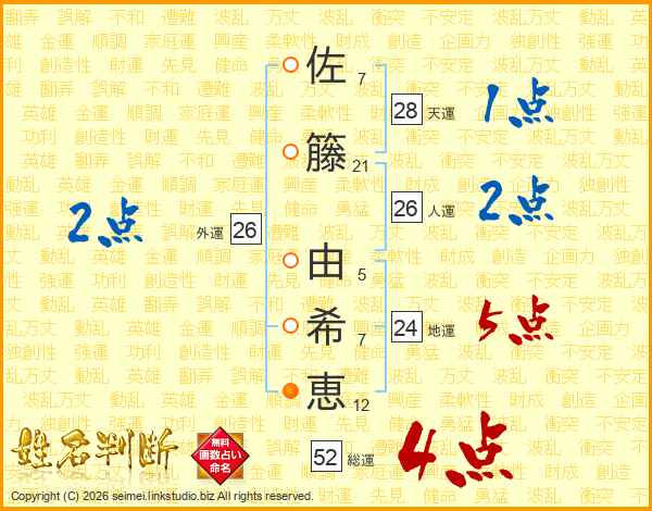 佐(7画)籐(21画) 由(5画)希(7画)恵(12画)