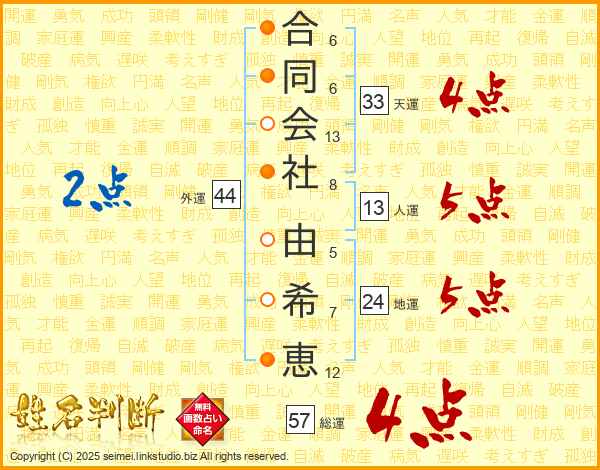 合(6画)同(6画)会(13画)社(8画) 由(5画)希(7画)恵(12画)