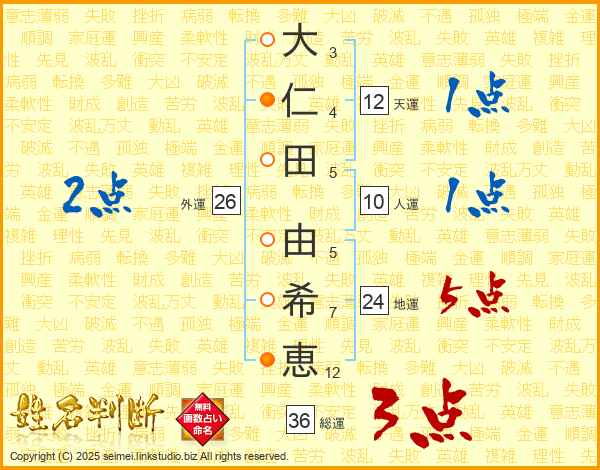 大(3画)仁(4画)田(5画) 由(5画)希(7画)恵(12画)