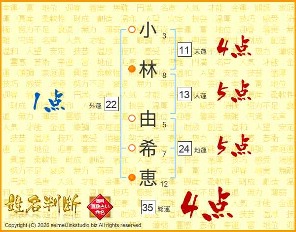 小(3画)林(8画) 由(5画)希(7画)恵(12画)
