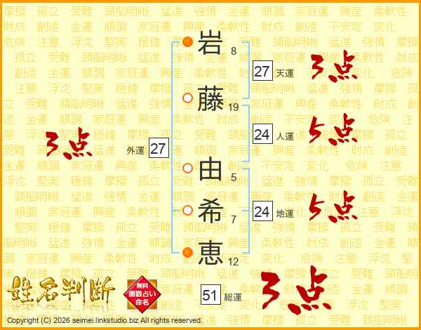 岩(8画)藤(19画) 由(5画)希(7画)恵(12画)
