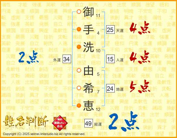御(11画)手(4画)洗(10画) 由(5画)希(7画)恵(12画)