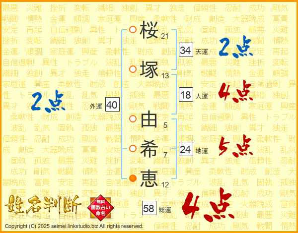 桜(21画)塚(13画) 由(5画)希(7画)恵(12画)
