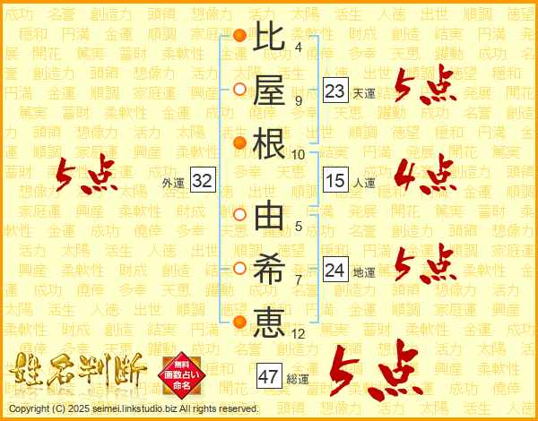 比(4画)屋(9画)根(10画) 由(5画)希(7画)恵(12画)