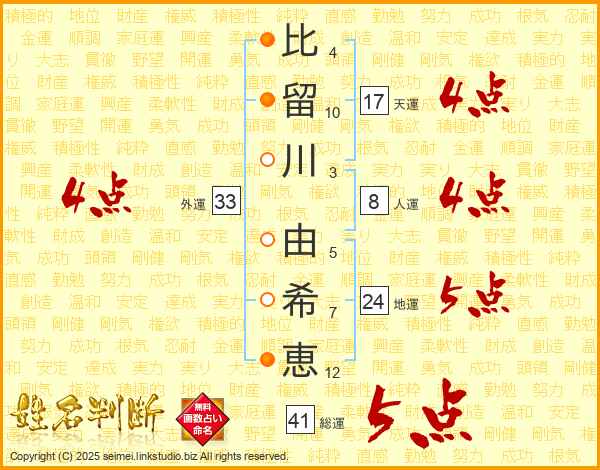 比(4画)留(10画)川(3画) 由(5画)希(7画)恵(12画)