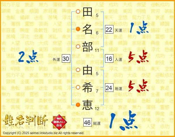 田(5画)名(6画)部(11画) 由(5画)希(7画)恵(12画)