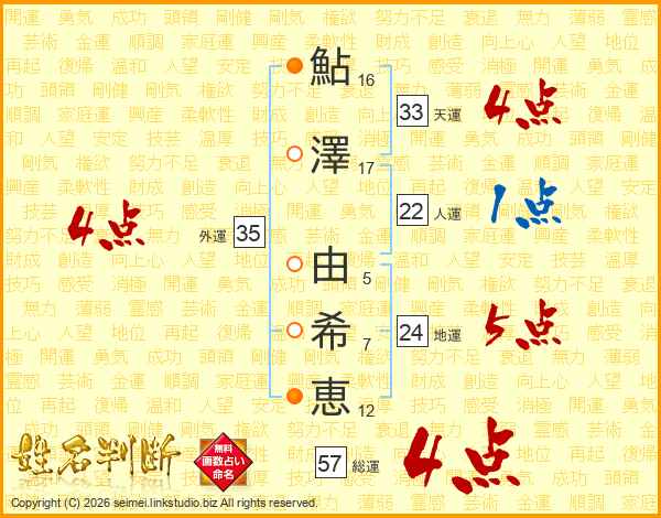 鮎(16画)澤(17画) 由(5画)希(7画)恵(12画)