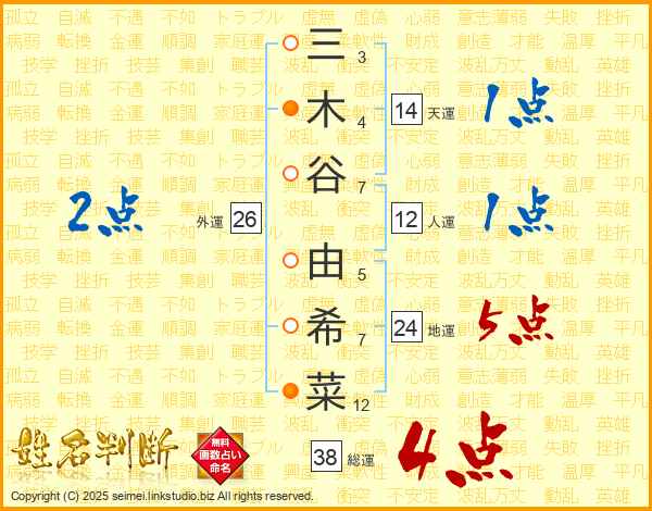 三(3画)木(4画)谷(7画) 由(5画)希(7画)菜(12画)