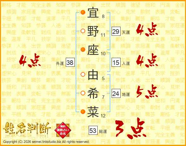 宜(8画)野(11画)座(10画) 由(5画)希(7画)菜(12画)