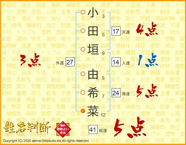 小(3画)田(5画)垣(9画) 由(5画)希(7画)菜(12画)