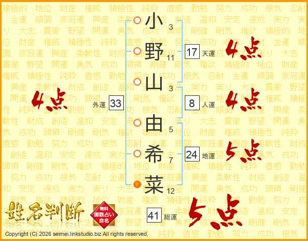 小(3画)野(11画)山(3画) 由(5画)希(7画)菜(12画)