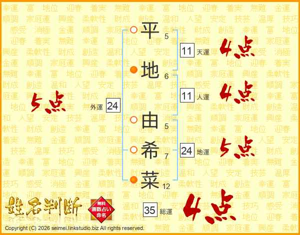 平(5画)地(6画) 由(5画)希(7画)菜(12画)