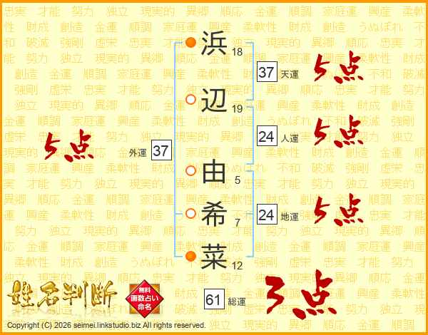浜(18画)辺(19画) 由(5画)希(7画)菜(12画)