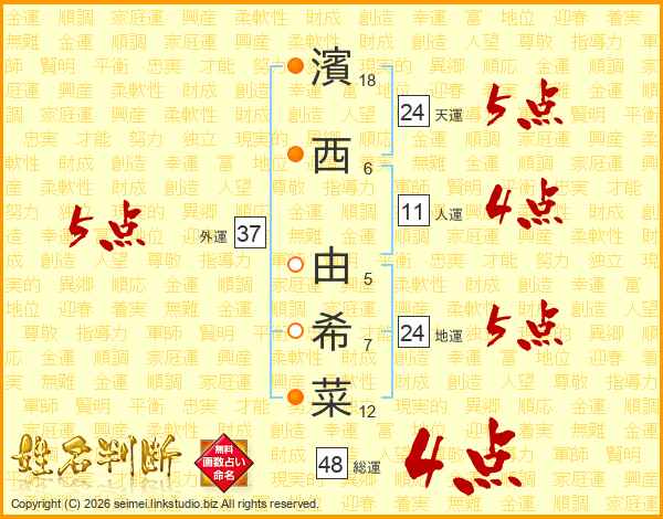 濱西由希菜さんの天運は24画の5点!