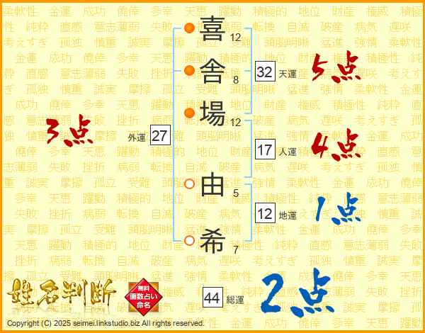 喜(12画)舎(8画)場(12画) 由(5画)希(7画)