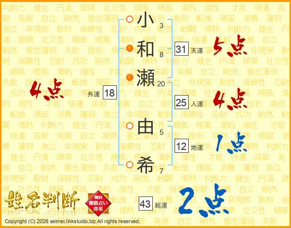 小(3画)和(8画)瀬(20画) 由(5画)希(7画)