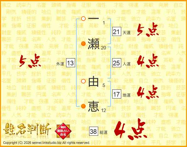 一(1画)瀬(20画) 由(5画)恵(12画)