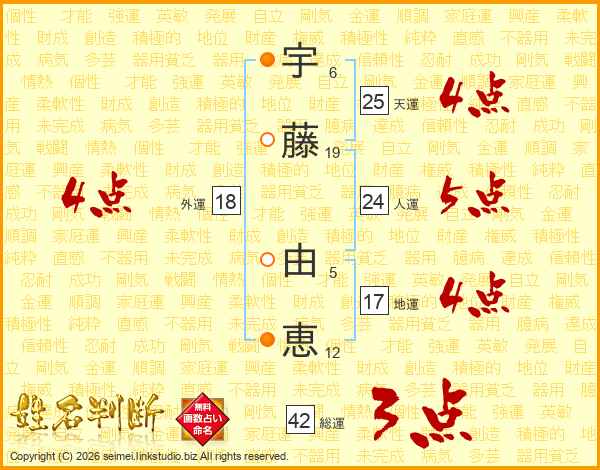 宇(6画)藤(19画) 由(5画)恵(12画)