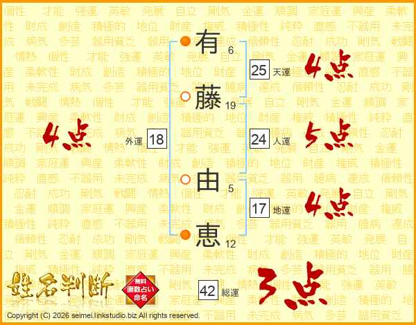 生活面を象徴する運勢です。外部から受ける影響力を表し、結婚運、家庭運や職場、環境への順応性を表します。総運から人運を引いた画数。姓や名が1文字の場合を除く。