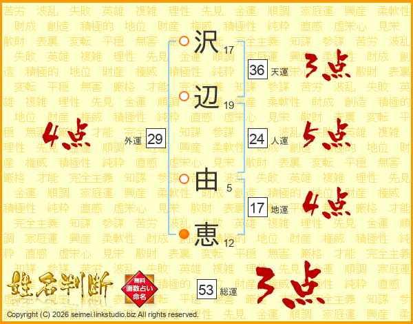 沢(17画)辺(19画) 由(5画)恵(12画)