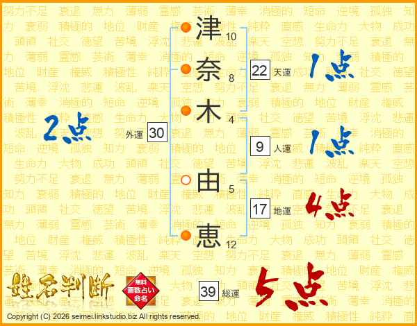 津(10画)奈(8画)木(4画) 由(5画)恵(12画)