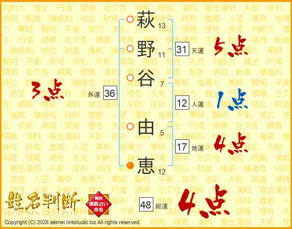 萩(13画)野(11画)谷(7画) 由(5画)恵(12画)