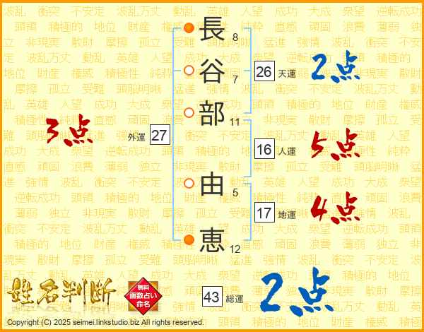 長(8画)谷(7画)部(11画) 由(5画)恵(12画)