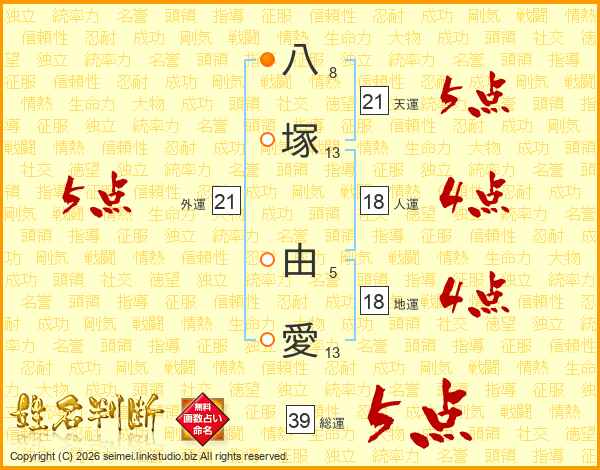 八塚由愛さんの総運は39画の5点!