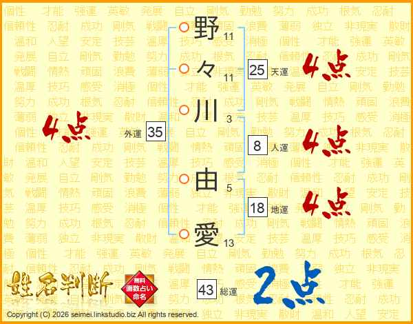 野(11画)々(11画)川(3画) 由(5画)愛(13画)