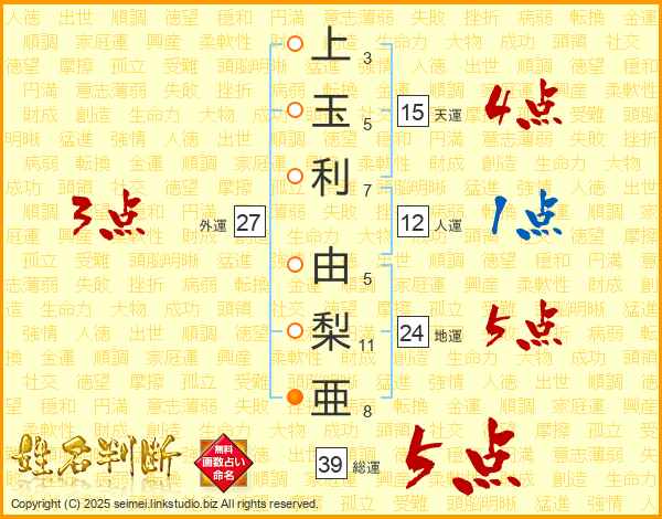 上玉利由梨亜さんの総運は39画の5点!