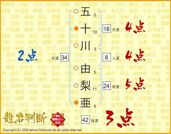 五(5画)十(10画)川(3画) 由(5画)梨(11画)亜(8画)