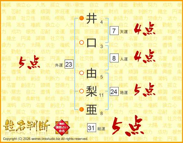 井(4画)口(3画) 由(5画)梨(11画)亜(8画)