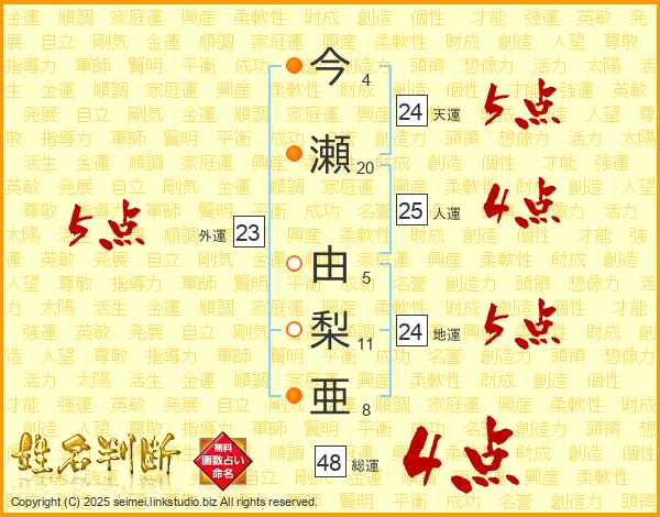 今(4画)瀬(20画) 由(5画)梨(11画)亜(8画)