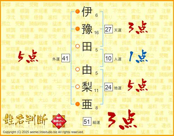 伊(6画)豫(16画)田(5画) 由(5画)梨(11画)亜(8画)