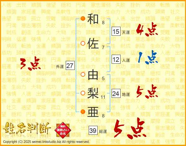 和(8画)佐(7画) 由(5画)梨(11画)亜(8画)