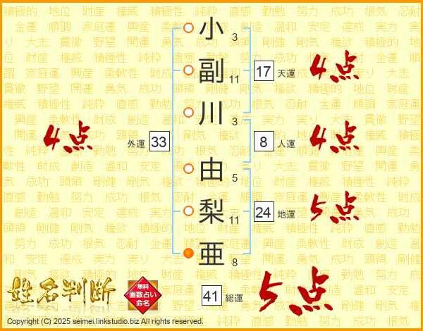 小(3画)副(11画)川(3画) 由(5画)梨(11画)亜(8画)