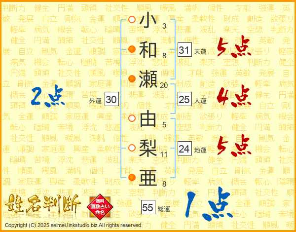 小(3画)和(8画)瀬(20画) 由(5画)梨(11画)亜(8画)