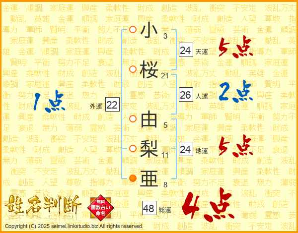 小(3画)桜(21画) 由(5画)梨(11画)亜(8画)