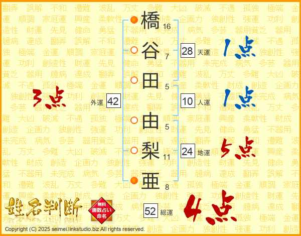 橋谷田由梨亜さんの総運は52画の4点!
