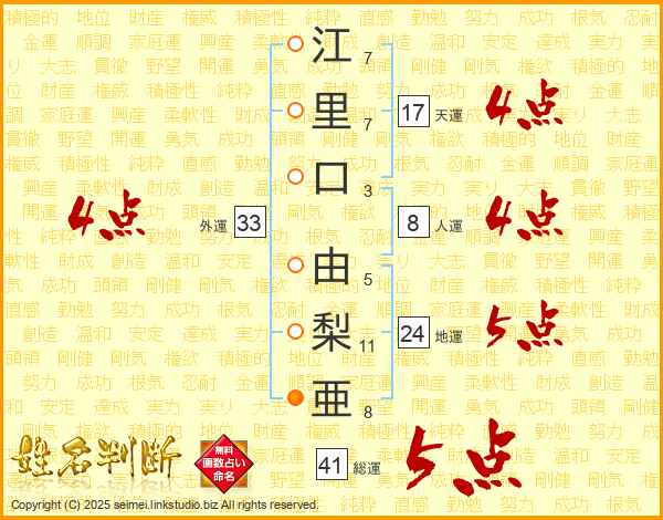 江(7画)里(7画)口(3画) 由(5画)梨(11画)亜(8画)