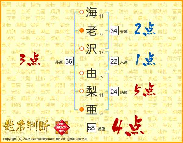 海(11画)老(6画)沢(17画) 由(5画)梨(11画)亜(8画)