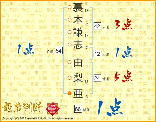 裏(13画)本(5画)謙(17画)志(7画) 由(5画)梨(11画)亜(8画)