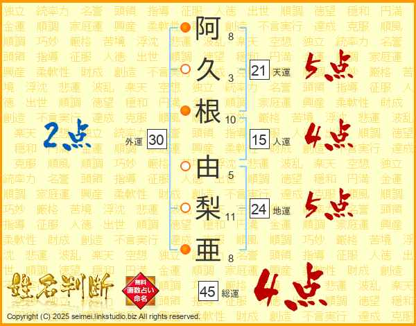 阿(8画)久(3画)根(10画) 由(5画)梨(11画)亜(8画)