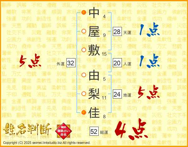 中屋敷由梨佳さんの総運は52画の4点!