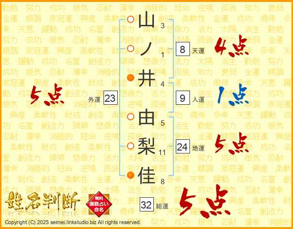 山ノ井由梨佳さんの総運は32画の5点!